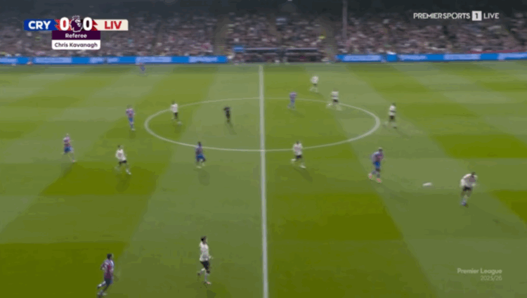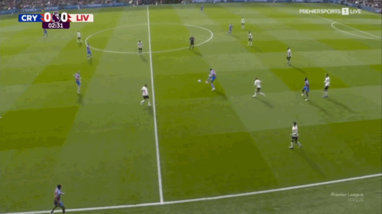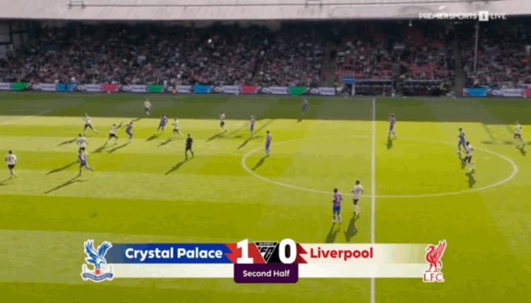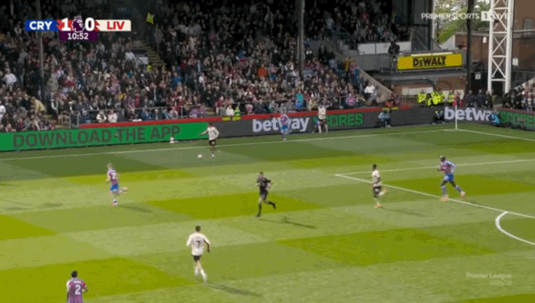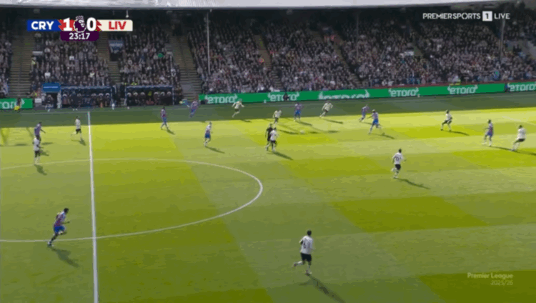 Wharton’s role defensively is to pickup Gravenberch when the ball is moved or starts from the left side and the Liverpool player moves into a more central position, especially when they’re building inside the Palace half. What Palace don’t want is for the game to become stretched and end to end because they’ll get overloaded in the middle every time with Liverpool having as manager as four players in there. What has become very apparent is Wharton isn’t sure of himself in duels, he looks hesitant and it shows in his attempts. Kind of putting a leg out, kind of not, chasing shadows in the 11th minute and 23rd minute.