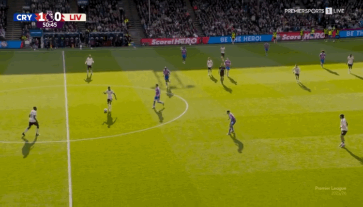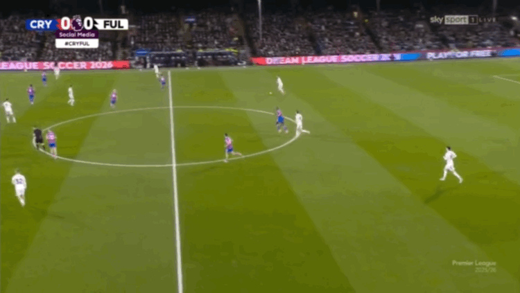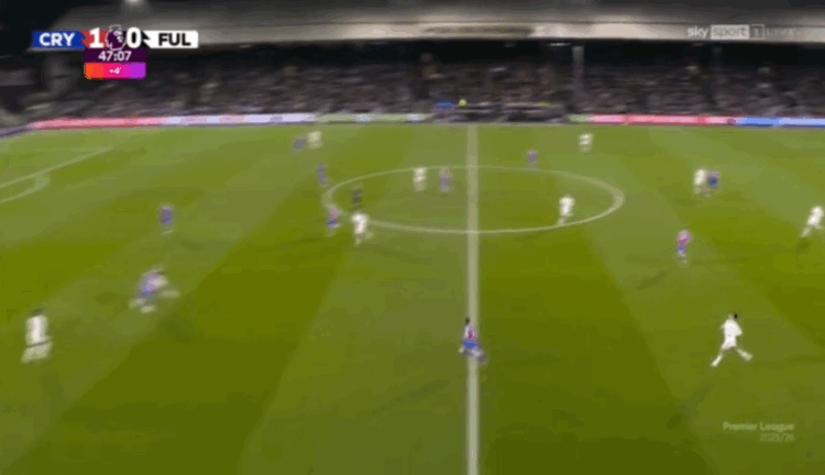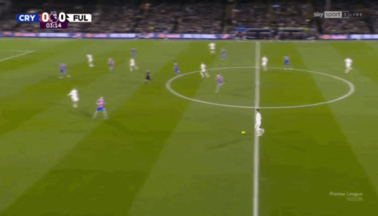 I think because it’s been so consistent in the game vs Liverpool and not even two minutes into the opening game vs Fulham, Wharton’s instructions out of possession are relaxed. Because you don’t switch off and be in almost auto-pilot mode that early. I think he’s allowed some grace by Glasner with the three centre backs being aggressive and covering for him if the space between the two central midfielders becomes too big. As you can see in below, the gap centrally widens, Wharton doesn’t increase intensity whatsoever, and even though nothing comes of it, there’s a free Fulham midfielder in the vacated space.