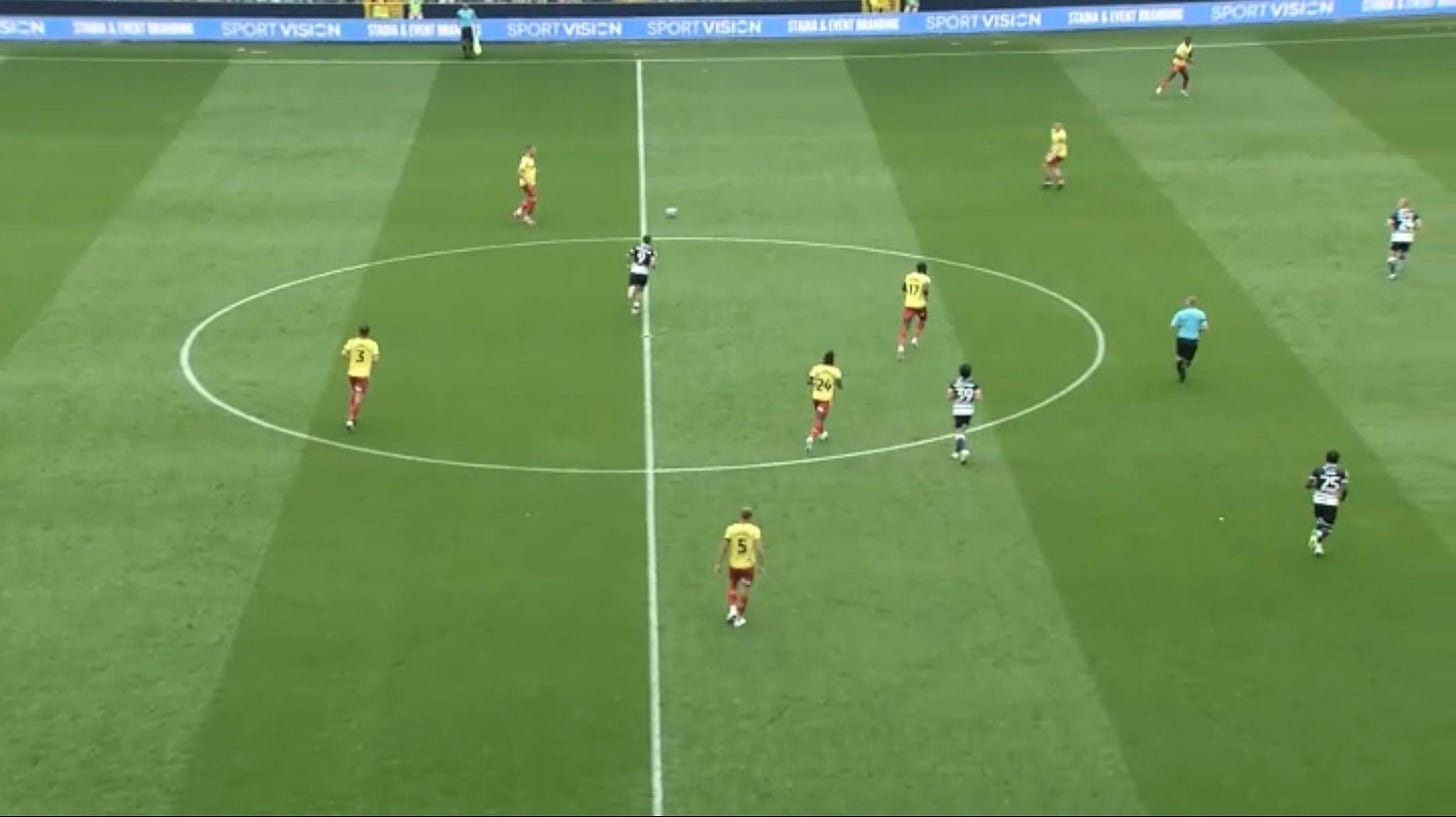 Starting with the three central defenders who are all excellent box defenders, but there’s variance with how good they are on the ball. Sierralta is very limited, Porteous is serviceable, same with Ogbonna and Morris — Pollock has come on leaps and bounds and is to my eye, you can categorise him as a ball playing defender. With how they’re utilised, Pollock is the one who starts the build from the back and has the responsibility to progress the ball either directly to the striker, into midfield or the most common route, to Andrews or Larouci. Ogbonna coming into the back three has made the world of difference from a calmness pov and how they look together. Despite their effort levels, something just didn’t feel quite right with Morris and Sierralta in that backline. In terms of line height, Watford are mainly in a mid-block, not a compact one mind you (I’ll get into that later), and drop their line to a lower block once pressure hits rather than opting to step up and engage