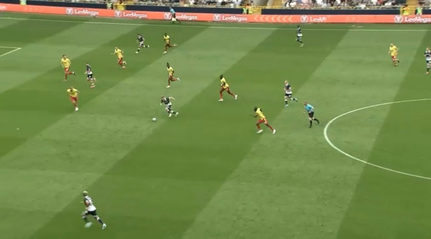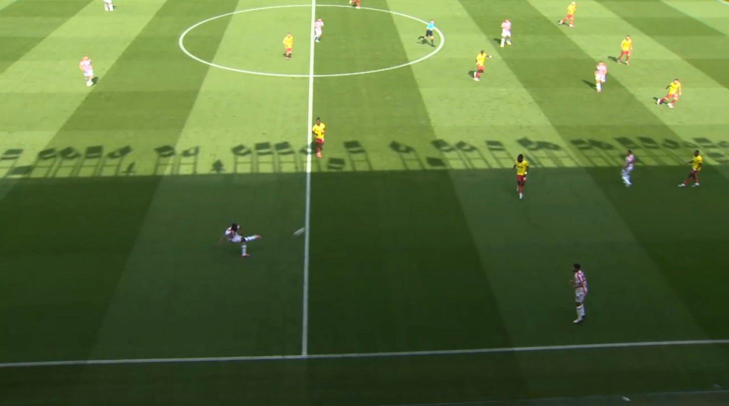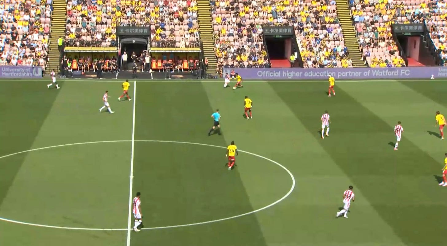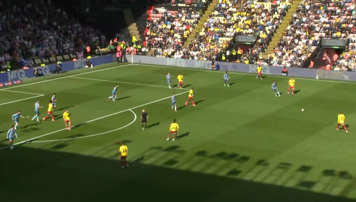 As I mentioned earlier, one of TC’s non negotiables was squeezing the pitch and pinning teams in when we have possession, and that means having every outfield player in the final third and looking to sustain pressure until a goal is scored. Watford have done this well this season and It has been a factor in every game we’ve played. However it does sometimes come at a cost when the ball is turned over and one direct ball down the middle can cause panic.