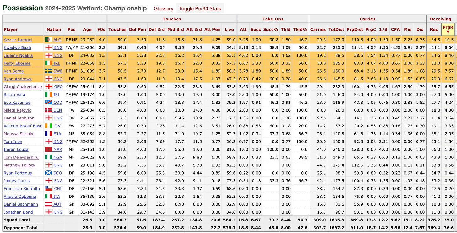 Moving onto the central midfielders, and this is where I have slight concern. But first I think it’s fair to contextualise their roles within the team and what they’re (Tom Dele-Bashiru and Moussa Sissoko) being asked to do. In possession, both of them close the gap between eachother and look to receive off the centre backs, mainly Tom Dele as he’s the ball player between the two. He dominates touches and passes received and played out of him and Sissoko, and understandably so. Off the ball, TDB is asked to press the right back with Sissoko backing him up so there isn’t space for the spare midfielder to drop in, but the issue here is, frequently Sissoko isn’t ready to close that gap and there’s huge gaps in the middle of the pitch, and sometimes the distance between back three and middle two is genuinely 15/20 yards and I think that’s more on Sissoko than anyone, although I do think Kayembe is a ball watcher too. In fairness to TC, our midfield of Kayembe, TDB and Sissoko are quite similar in skillset in that they’re good at driving with the ball and ok at everything else. The two in the middle probably have the hardest job out of any in the team as they have to cover a lot of ground, and I’m not sure it’s viable. Out of all the double pivots in the league, Watford rank 21st for ground duels per 90 (possession adjusted) but both of them rank highly for winning %, which mirrors the eye test, but it also mirrors the eye test in that they don’t actually do much defensive work anyway, especially Kayembe and Sissoko. It seems like I’m grilling Sissoko but I’m not, I think the pressing structure puts a lot of responsibility and he’s not able to produce it consistently. In the first game vs Millwall it was evident too; lazy tracking back and not being able to close down with TDB.