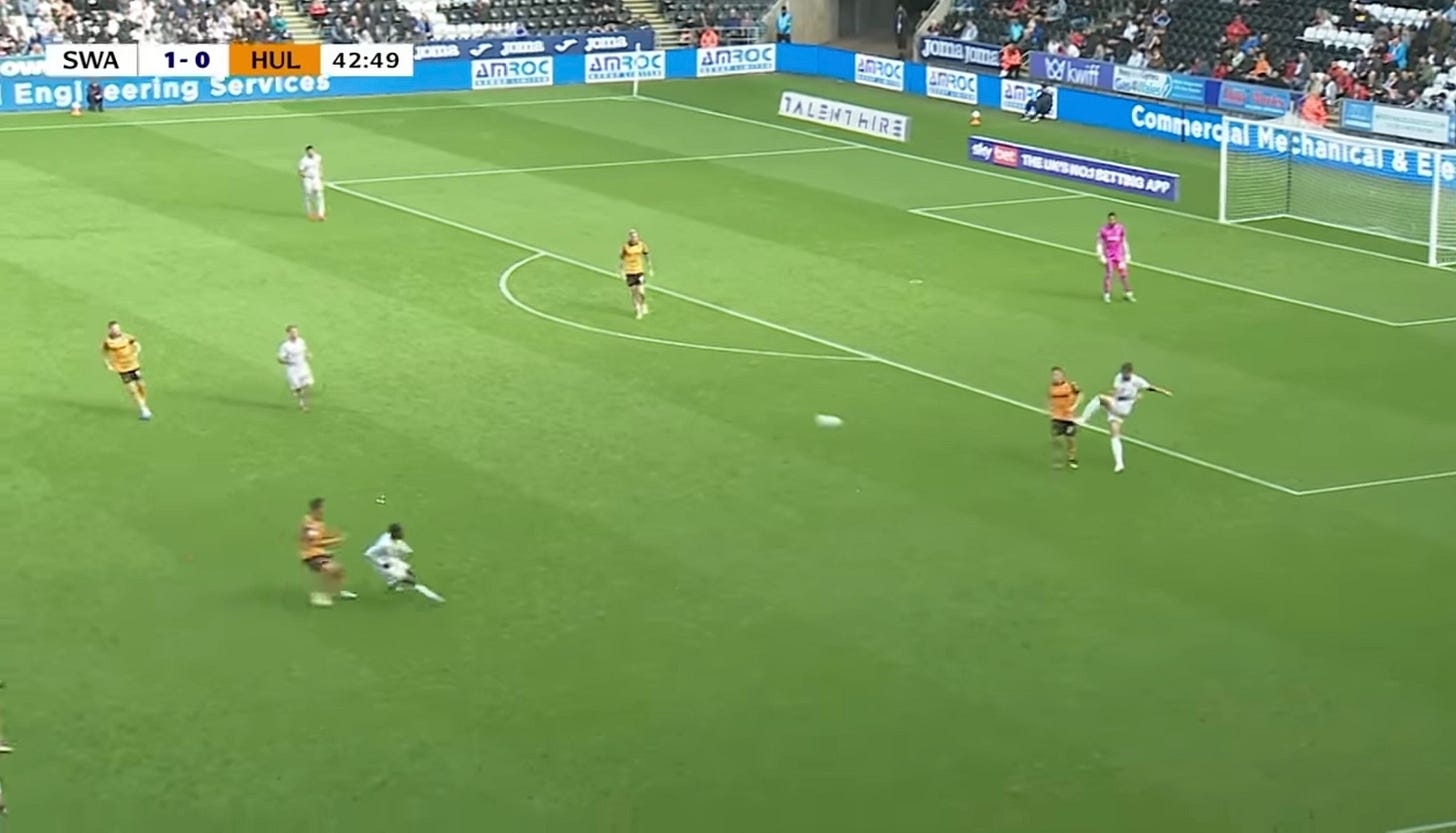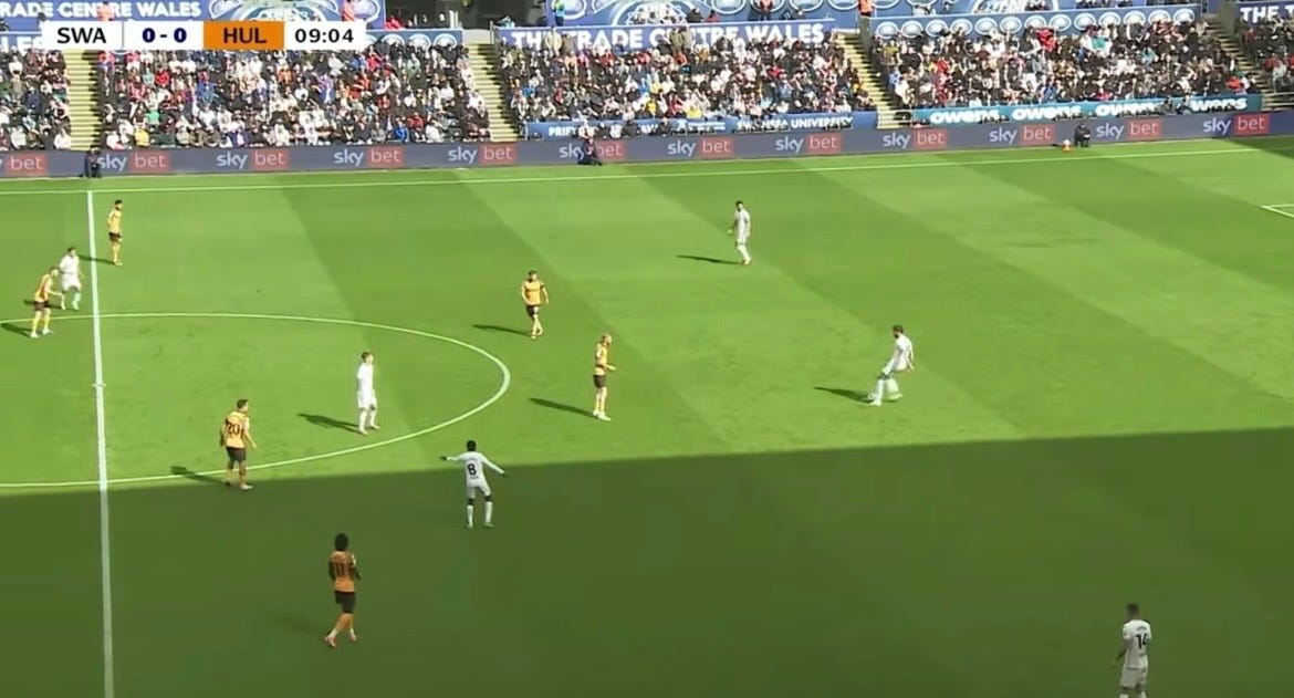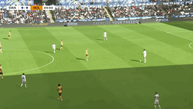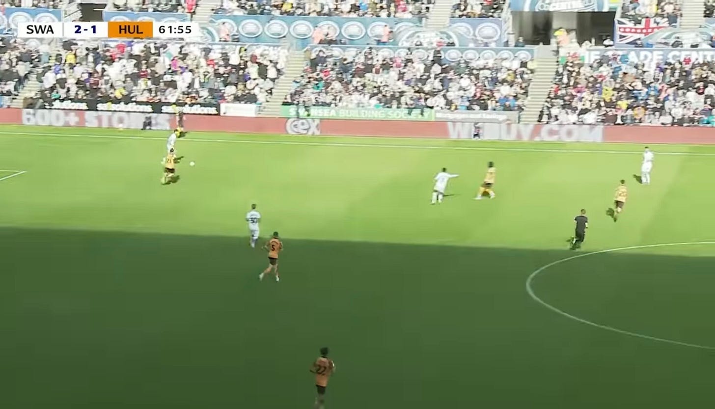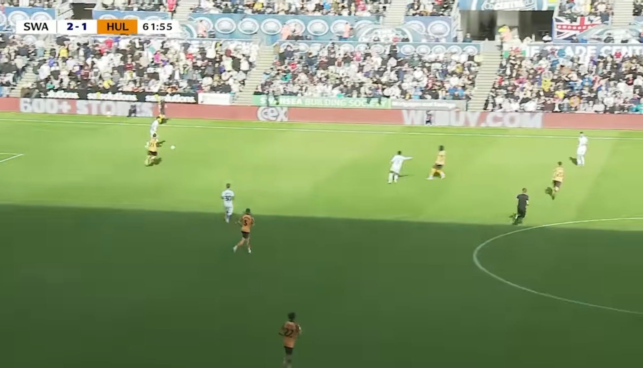 Watching back Hull’s last two games vs Swansea and Southampton, they might be one of the weirdest teams I’ve watched from a tactical pov. I did watch their games vs Bristol City and Blackburn too but the setup has changed and as I mentioned, the last two games I’ve seen is more relevant as the strategy was consistent. Basically everything is so obvious in what they’re trying to do but in a chaotic way. Pandur (GK) goes long at almost every opportunity, their centre backs play it around a bit and then go long, neither of their midfielders want to get on the ball and if they do it’s only one of them, the right winger regardless of who it is touches the ball 2% of the time (that’s not made up, that’s factual) and Ryan Giles (LB) leads the team with touches in the final third. Narrow 442 press off the ball too and there are some quirky things going on as well which I’ll get into and despite me sounding dismissive of what I’ve seen, the coach there is clearly working to the strengths of his players, which again I’ll go into.
