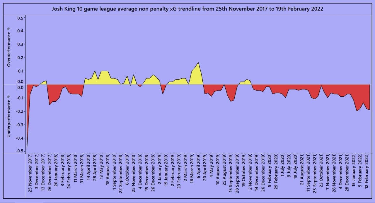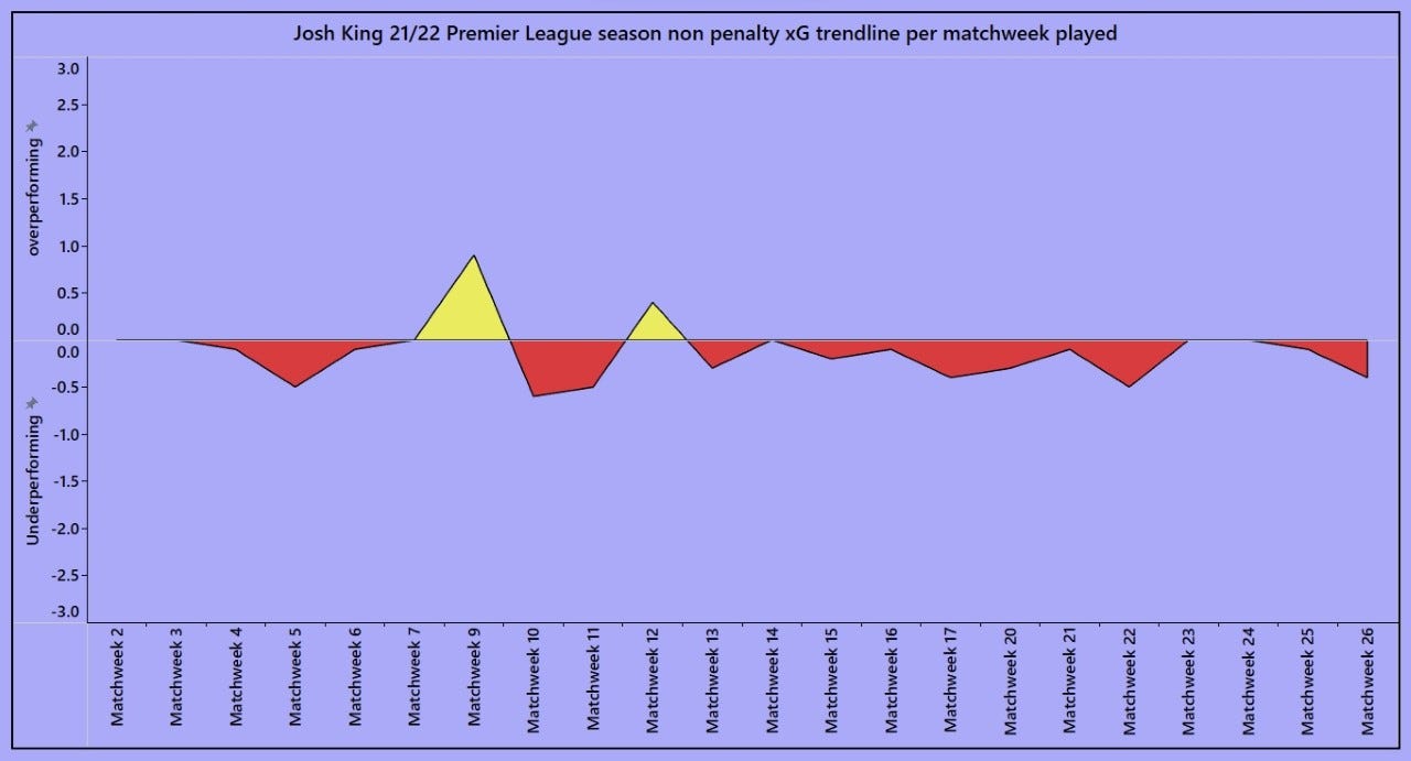These are the last three games for average positions for Watford players. For King’s role to truly work, it needs him to perform like he did in the second half vs Aston Villa. He was involved in everything good Watford did — He made the pass to Sissoko, won his duel to set Louza off for the goal, and got in front of his man to muster a good chance, which he probably should have done better with. The question is, does his ability to drop deep and play through balls and start attacks, outweigh the lack of goals? Only time will tell. Over the course of the season, King has scored in two games (non penalty goals ofc) with 3/4 goals coming in one game against Everton — taking out that game specifically, King averages 0.25 non penalty xG per 90 — which (you should never do this) projects him to score another 5 goals judging by his finishing ability; 0.25 npxG is the same as Richarlison, Smith-Rowe, Rashford and Raphinha. King’s finishing over the course of the season has been quite bad, but he is getting into good positions and taking higher quality shots than most, which can only be a good thing.