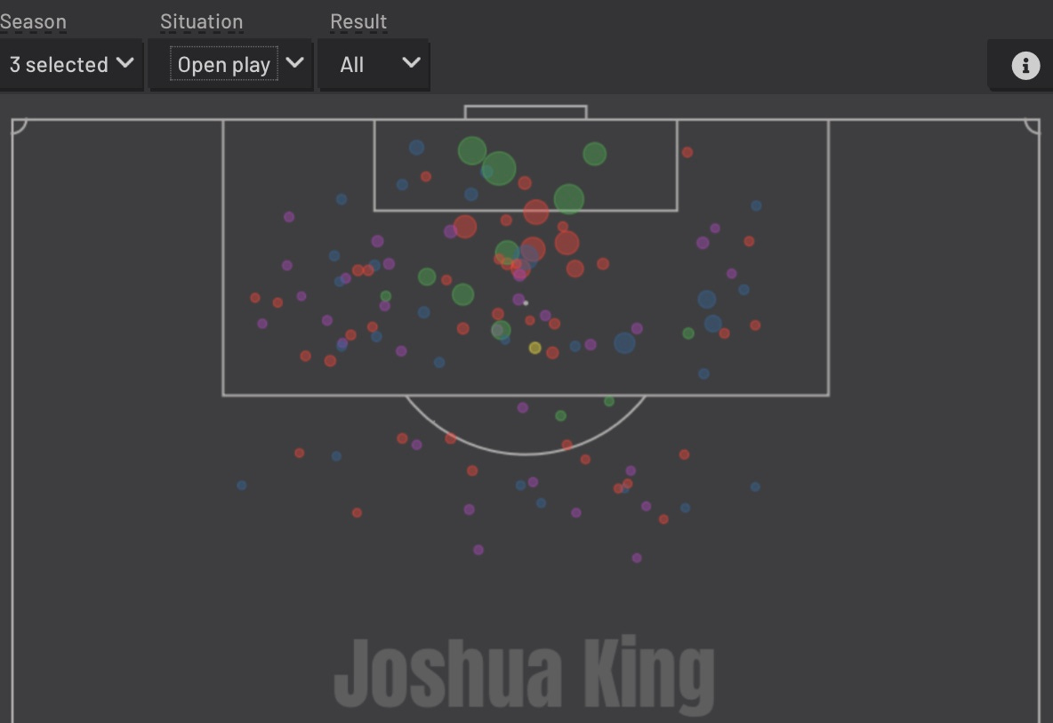 The short answer he’s doing just fine; not bad, not amazing. But there’s other factors into some of his play and other things out of his control. Firstly, and the most obvious one is the unbalanced squad, the chaos that’s been happening at the club since relegation in the 2019/2020 season, and going through another three managers in a season — all three having different methods and style of play. Looking at his time at Bournemouth, King was used as a number 10 or a left sided forward that can stretch play to leave Wilson in the middle to finish chances. Given King was sat in the hole of the two players, Wilson was able to take the defenders away, freeing up King to score goals from cutbacks via the fullbacks/wingers. Most of these goals came from the left side of the box, where King would often peel off. 16 of his 36 non penalty goals came from a cutback/cross into the box; he also scored a lot of goals from getting the second contact off a set piece, where he’d tail off to the back-post to tap home.