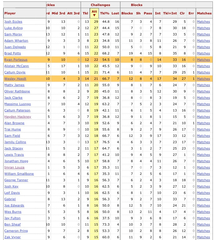 If you look at the numbers, we’ve faced the fewest shots (part of that will be because we hold onto possession a lot) and we’ve given up the fewest chances in terms of xGA (5.66) in the league. However, I wouldn’t say we’re defensively solid and I don’t think the way we’re doing it is sustainable. Yes the teams we’ve faced so far haven’t really got into good shooting positions and I do think the way we defend is by design to live on the more chaotic side; which is fine, but there will be a game that we’ll come undone IF we aren’t careful with the passes into midfield, or we lose the ball cheaply. The way we set-up puts the centre backs; Porteous and Hoedt in dangerous positions anyway, they’re not the best defenders in the first place so the risk is already there regardless. Quite a number of times this season we’ve left them both 1v1 with 3/4 attackers running at them, and they’ve either won or did enough to put them off or Bachmann has made a good save. In more or less every game this season — a situation like this below has happened but we’ve been lucky in not many times a shot has occurred.