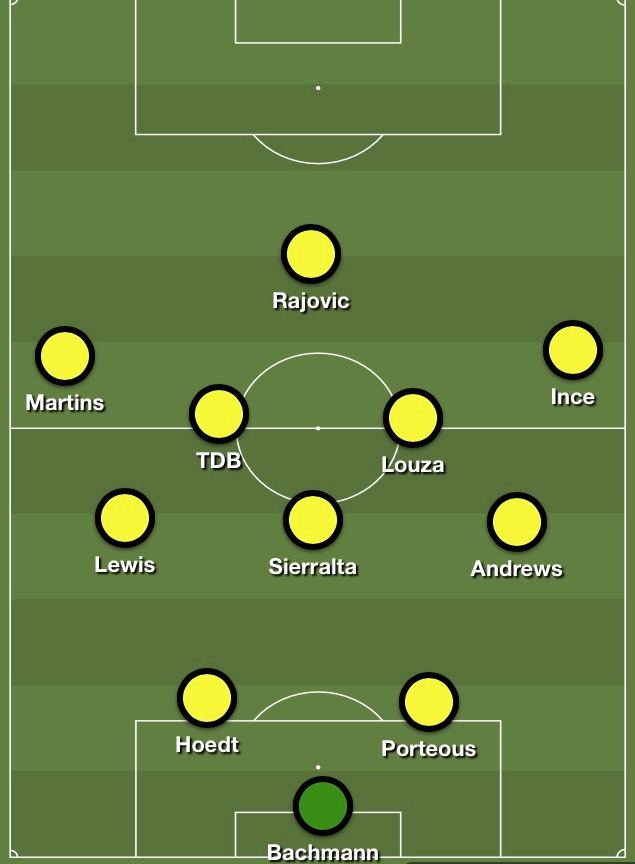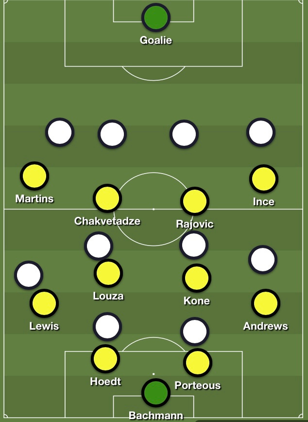 My solution would be to slightly change our structure on goal kicks and go to a 3-4 build. Mainly because it allows the full backs to stay wide and it gives us more opportunity to play around the opposition. If the opposition wants to press us deep into our half, not only does it create space down both sides of the pitch to quickly play into if possible but crucially the starting point of the ball at the centre backs; they can take out up to 4 opposition players. Usually it’s Hoedt who has the ball, so in my 3-4 set-up, if he’s being pressed; he can quickly knock it to Porteous who can play a one touch pass into one of the two central midfielders. If both centre backs are being pressed, that means you can play it into the midfield straight away and avoid pressure.