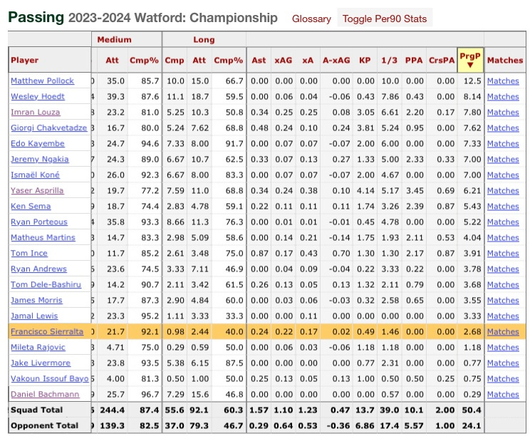 But in fairness to us, we are really good at getting back into our shape very quickly. To emphasise how much our centre back pairing has to do, both of them rank inside the top 10 in the league for 1v1 challenges contested, with the next centre back on the list is down in 34th. So the only two centre backs in the entire league to consistently be tested 1v1 are at Watford. Whilst it is by design as I mentioned previously, one game it will go wrong and we could be on the end of a heavy defeat. The reason it happens is mainly because Sierralta is not good enough on the ball in those areas of the pitch; he looks at his first touch and he’s often a trigger press for opposition players to put him under pressure. Which is partly why we move our full backs centrally so there’s minimum four options for him in best case scenario.